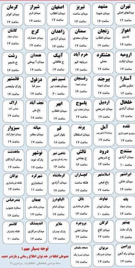 تتوسع المظاهرات الشعبية العارمة في إيران علی نحو متسارع، حيث انطلقت الخميس الماضي من مدينة مشهد، شمال شرق البلاد، وسرعان ما امتدت إلی العاصمة طهران والمحافظات الأخری، بينما تستعد 70 مدينة للخروج اليوم الأحد، بمظاهرات عارمة حسب ما جاء في ملصق انتشر بشکل واسع عبر مواقع التواصل ويحدد زمان ومکان انطلاق المظاهرات في نقاط التجمع المذکورة.